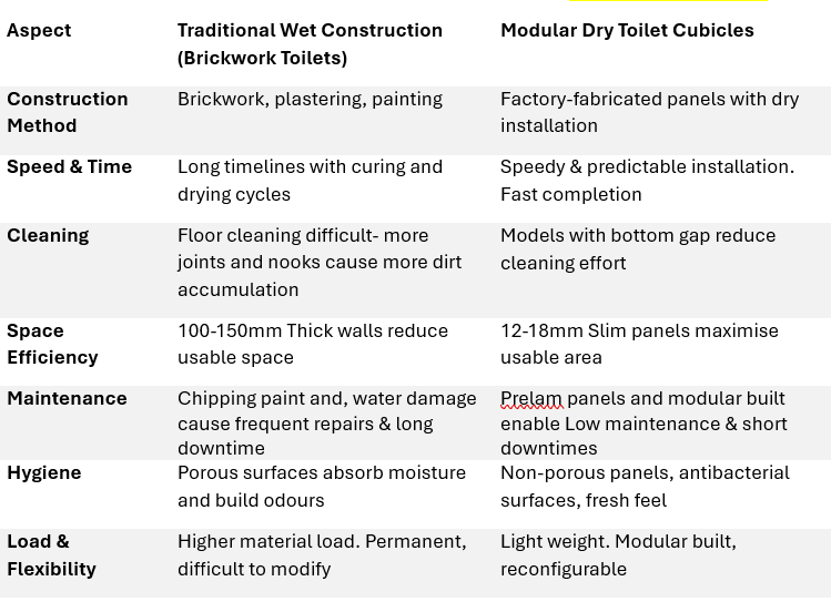 Unlike conventional construction, modular toilet cubicles are installed without wet civil work, curing time, or on-site fabrication. This dry-installation approach ensures cleaner sites, predictable timelines, and minimal disruption making them ideal for offices, malls, airports, hospitals, educational institutions, and other high-traffic facilities. The result is a refined restroom solution that performs reliably over time while offering architects and facility managers complete design control.