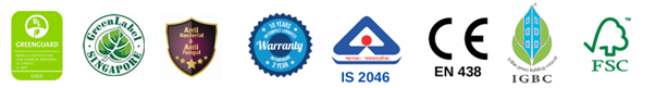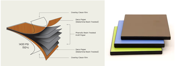 High Pressure Laminate compact board is made up of layers of kraft papers saturated with phenolic resin (which determines the thickness and core of the board). A decorative paper on the top and bottom is saturated with a special melamine resin which determines the design and colour. A clear top overlay film improves the resistance of materials regarding abrasion, scratch and heat. These layers are compressed under high heat and high pressure ((≥1000 PSI) in which thermosetting resin curing makes strong irreversible bonds creating a single rigid laminated sheet with density (≥1350kg/m3) and weight (1.66 kg/sqft). The board is manufactured as per IS 2046 and EN 438 std.
